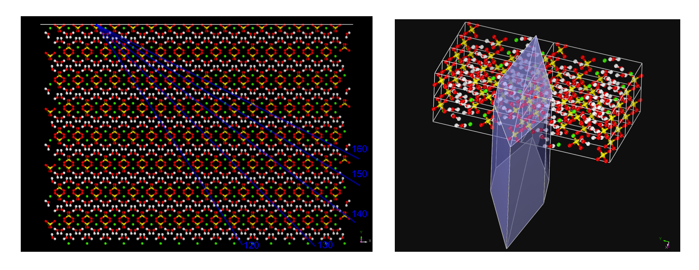 Crystals are solid made by the repetition in space of atoms or clusters of atoms (molecules). This repetition is periodic, i.e. the atom or the cluster in a given position repeat at fixed distances one each other, like in the picture below showing the structure of gypsum, made of calcium atoms (green) sulfate SO4 groups (yellow S, and red O), and two moleucles of water H2O, (white H and red O). Because of this translational symmetry the external shape of the crystals are made by crystal planes (in blue) and the general, classical view of a crystals is a polyhedron like in the right figure.