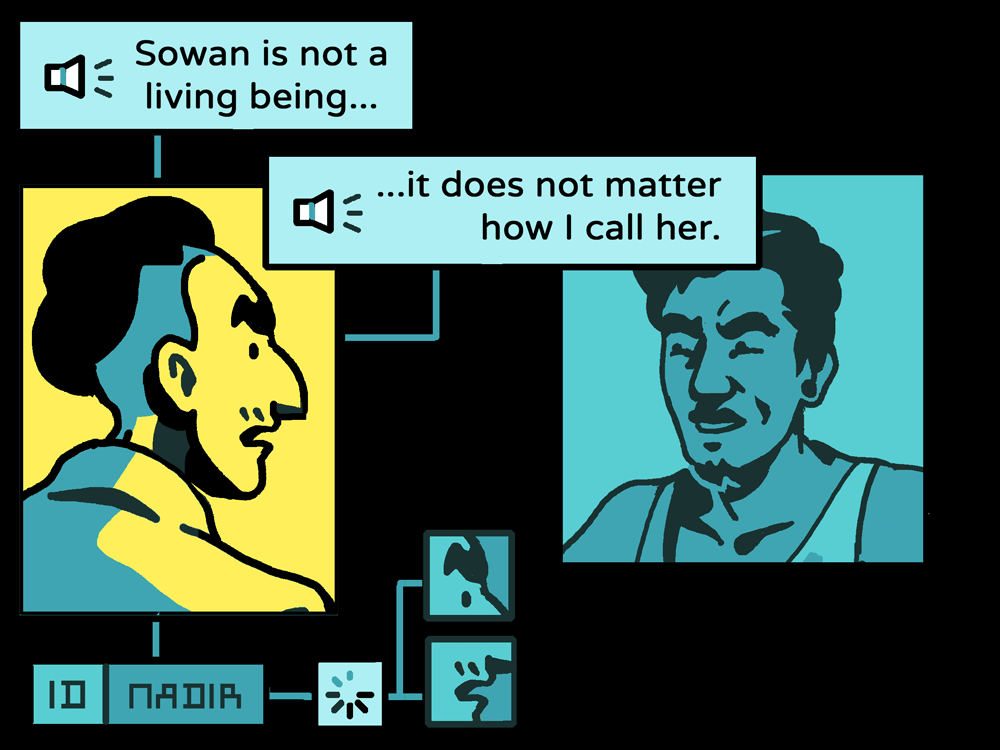 In this chapter you also had a glimpse of a “second level” where a discussion about the scenario itself takes place. The idea here is to literally illustrate the process of metacreation, which is what happens when machines exhibiting creative behavior are able to reflect on their own process of creation.